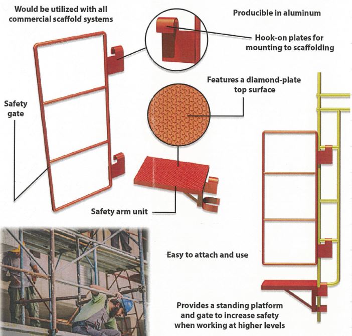 I wanted to provide scaffold users with a standing platform and gate to increase safety when working at higher levels, so I invented this. My design would help to prevent workers from falling off the scaffolding.