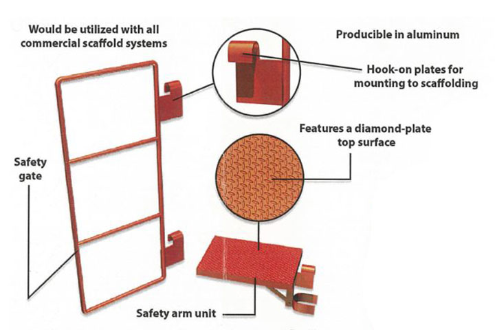 I wanted to provide scaffold users with a standing platform and gate to increase safety when working at higher levels, so I invented this. My design would help to prevent workers from falling off the scaffolding.
